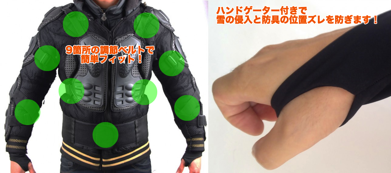 | 1.バネのように衝撃を吸収する「3層の耐衝撃構造」により 強い衝撃から身体を保護! 「EVA(ソフト素材)」と「PVC(ハード素材)」の間に「ルーム(空間)」を持たせる 三層構造でしっかり衝撃を分散&吸収! ! 高い衝撃分散性能により「アイスバーン」や「ジブ」のでの転倒、また「グラトリ」等での アクロバティックな転倒でも保護効果を発揮。 背中と腰のプロテクターが身体を保護し、怪我防止に役立ちます。 2.万が一の事故から「背中・腰・胸」の急所を守ります! ゲレンデで多い事故といえば、コース上で座っている人への背後からの衝突。 また、コース外への転落、リーシュコードから外れたボードへの衝突なども少なくありません。 「大好きなウィンタースポーツを安全に、そしてこの先もずっと楽しんで行きたい! ! 」 そんな気持ちに共感していただける方のいざという時、このプロテクターはきっと効果を発揮してくれるでしょう! ![]() 3.ムレにくさはトップクラス! 驚くほどの通気性! 伸縮性に優れたメッシュウェアを採用することにより、バツグンの通気性を実現しました。 スパッツウェアではないため、汗をよく吸うインナーと併用することで、驚くほどムレにくく快適に着用することができます。 ![]() 4.優れたフィット感! もはやコレは自分専用のプロテクター! 収縮性に優れたメッシュウェアは、各箇所の伸縮ベルトで身体にぴったりフィットさせることができます。 そのため、インナーを変えた場合でも、フィット具合や防具の位置を 簡単に調整でき、ご自身が動きやすいオリジナルのプロテクターを作ることができます。 ![]() 5."しなやか設計"でトリック時も自由な動きを妨げない! 可動箇所の多い構造により、プロテクターが体の動きに合わせてしなやかに動きます。 そのため、トリックや体重移動時等の「ひねり」が必要な場合でも自由な動きを妨げません。 だから! スキー・スノーボード、更にはSK8、BMX、インラインスケートには特にオススメなのです! ![]() 6.保護されている安心感が逆エッジの恐怖心を軽減し、 最後まで気持よく滑ることができます! スノーボーダーやスキーヤーを特に悩ませる「アイスバーン」での逆エッジ転倒からも「ヒジ・背中・腰」を保護しますので、痛み軽減だけでなく、「あぁ...転んでヒジついたら痛いぞ...」という恐怖心と嫌なストレスを軽減してくれる効果があります! そのため、たとえアイスバーンが続く旅行でも最後の最後まで気持よく滑ることができるでしょう。 7.打倒! 有名メーカーでは実現し得ない圧倒的安さで勝負! 上記のように有名メーカーにも負けない性能を持ちながらのこの超低価格! 「安すぎて不安だ」そう思ったアナタ! ! この超低価格には理由があるのです! (キリッ) ・海外の工場との「直取引&直輸入」による超大幅なコストカット! ・有名メーカーのようにブランド価格を上乗せしていない! これにより有名メーカーでは実現し得ない"超低価格"でご提供することができています! 8.満足度No.1宣言! 自信があるからこそ3大保証付き! 【お試し返品保証】 商品がお気に召さない場合も返品できます! 【初期不良への30日間完全対応】 ご連絡頂きましたら速やかに対応致します! 【自信があるからこそメーカー保証1年付き】 お気づきの点が有りましたらご遠慮なくご連絡ください! 【お客様へ御願い】 本商品のブランド『ウミネコ(UMiNEKO)』の商品は 独自工場との契約により製造された製品です。 現在問題になっている外装だけを真似た粗悪な類似商品の販売に関しては 一切関知及び認知しておりませんので、販売元をよくお確かめの上でご購入をお願い申し上げます。 販売元:ウミネコ(UMiNEKO) ※ストア情報に記載の通り本店ALPHA x ALPHAはウミネコ直営でございます。 ご安心してご利用下さいませ。 こだわりを持っていなければ・・・、 きっとこのプロテクターが多くのフィールドで 活躍してくれることでしょう! |